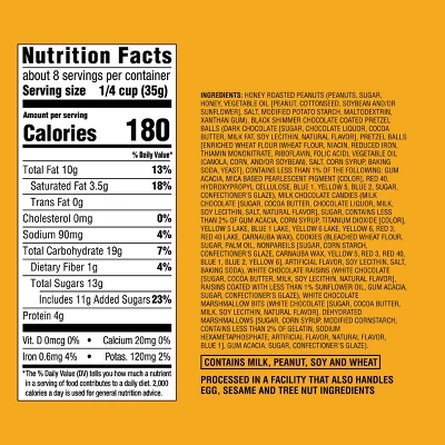 - With honey-roasted peanuts, dark chocolate-covered pretzel balls, orange, green and purple milk chocolate candies, cookie pieces, white chocolate-covered raisins and marshmallows